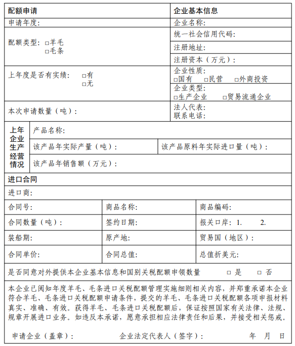1.羊毛、毛条进口关税配额申请表(附2),可从商务部网站(www.mofcom.gov.cn)下载。为便利企业,自2024年起,羊毛、毛条进口关税配额申请表不再区分贸易方式,企业在申领羊毛、毛条《中华人民共和国农产品进口关税配额证》(以下简称配额证)时自行选择贸易方式。