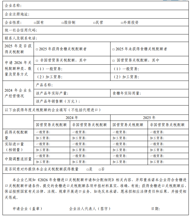 根据商务部、国家发展改革委令2003年第4号(《农产品进口关税配额管理暂行办法》),商务部制定了2026年食糖进口关税配额申请和分配细则。